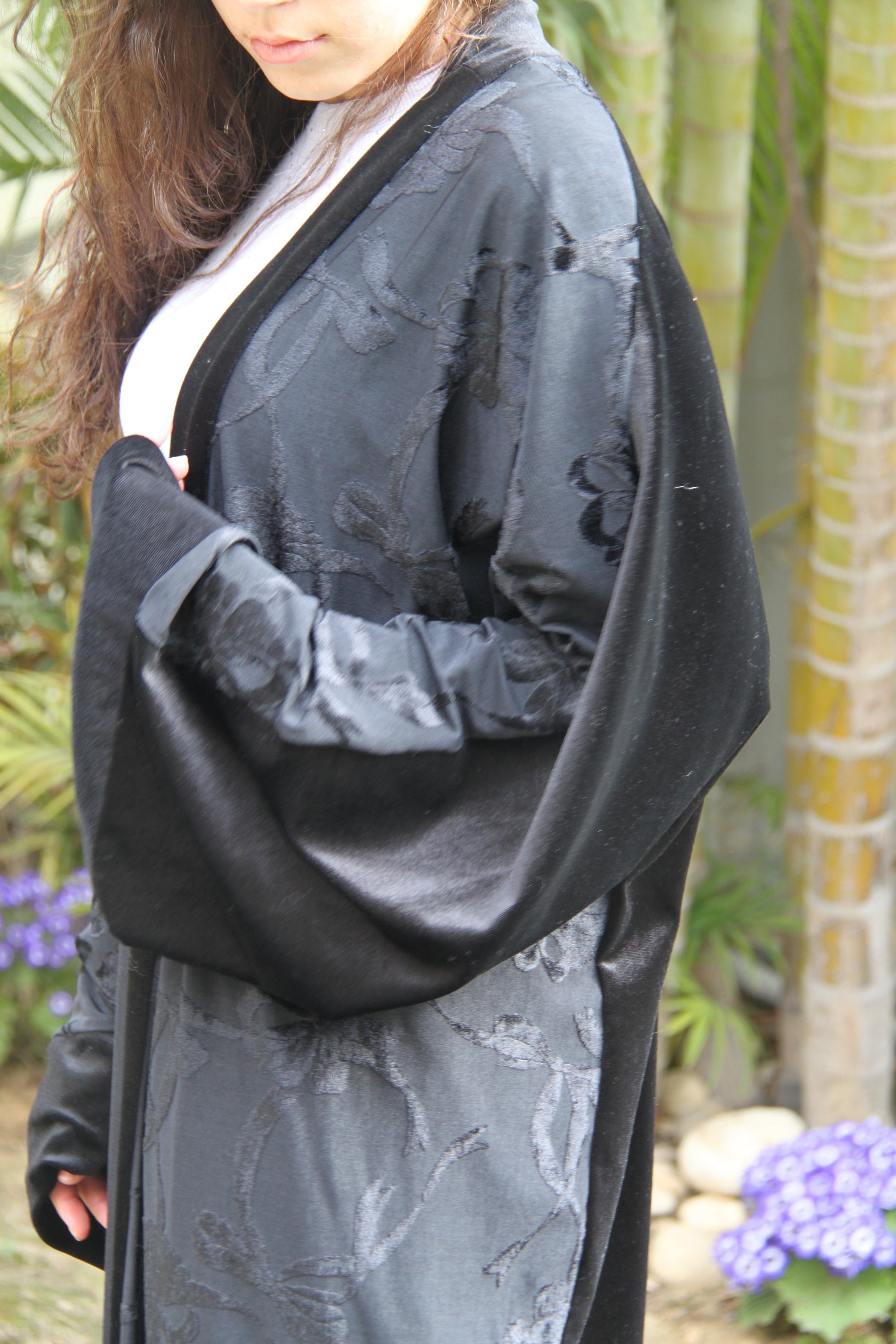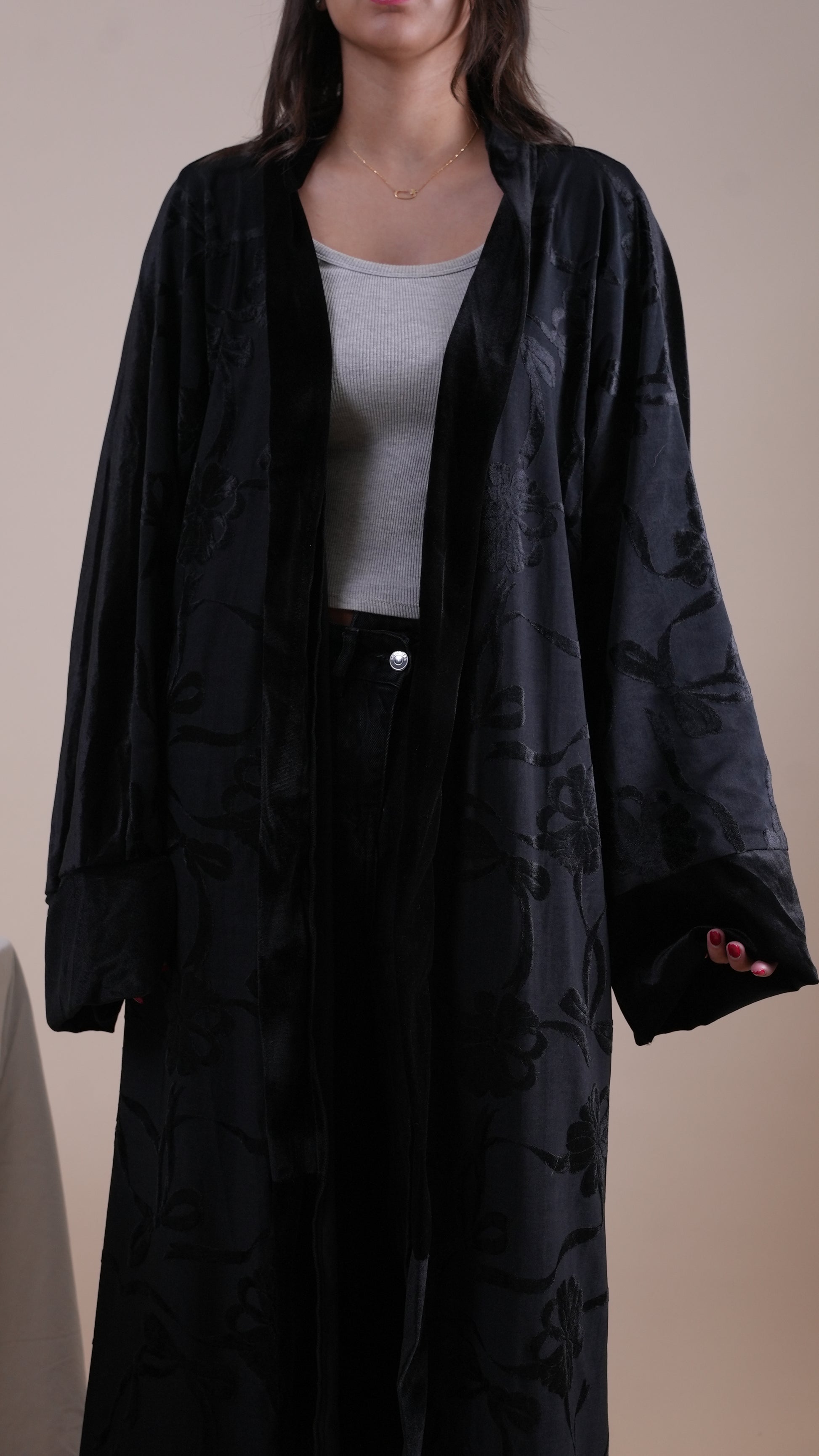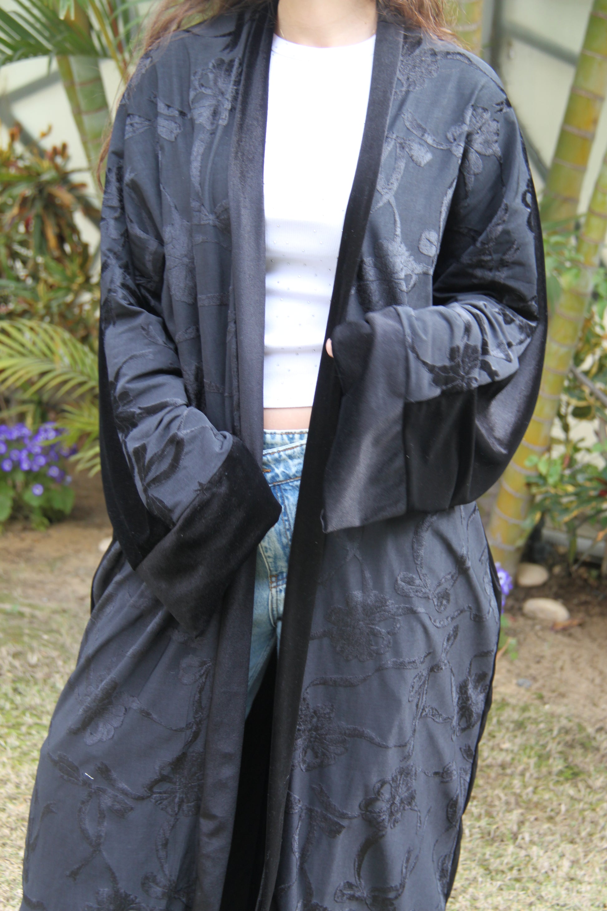 This black ribbon kaftan is made from velvet material. The Front is full of velvet ribbons while the back is velvet black.