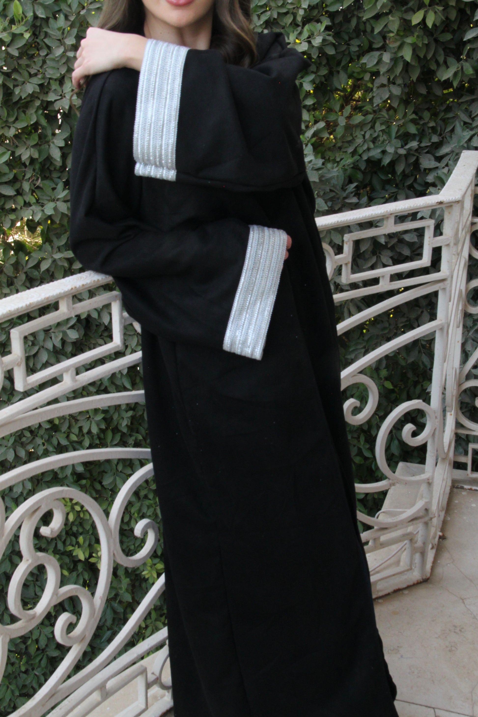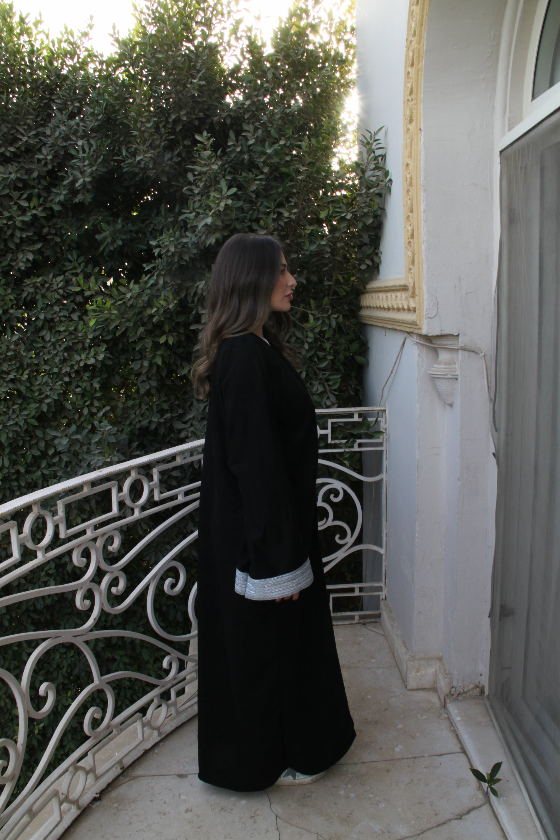 Crafted from soft suede fabric, this black kaftan is designed for effortless elegance during Ramadan and beyond. Featuring a relaxed silhouette with subtle structure, it’s finished with delicate silver-embroidered cuffs that add a refined touch without overpowering the look.