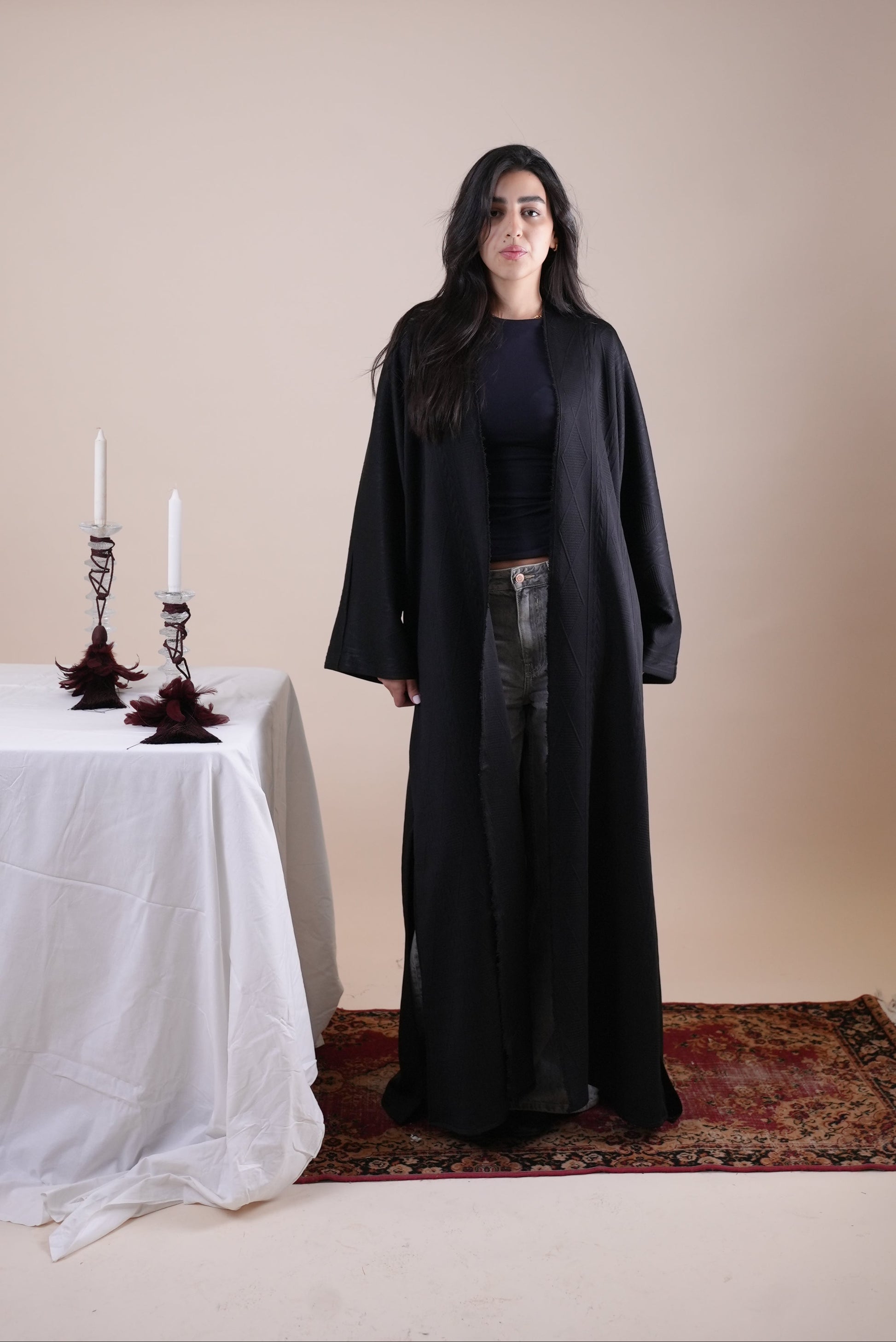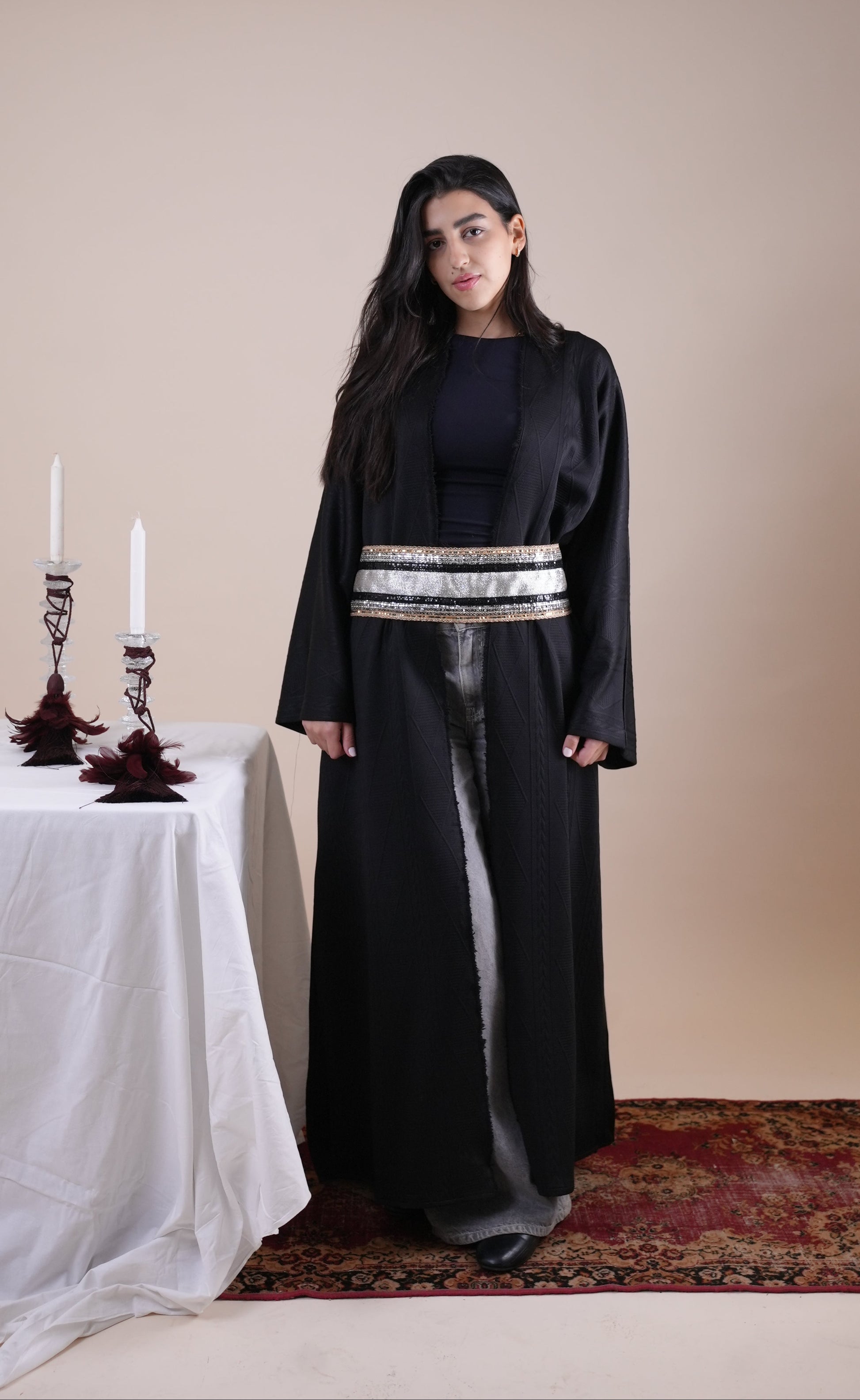 The Black Tricot Kaftan is crafted from textured tricot fabric, offering a fluid silhouette with a refined finish. Designed with an open front and subtle woven detailing, it’s elevated by a statement metallic belt that defines the waist and adds a touch of understated shine.