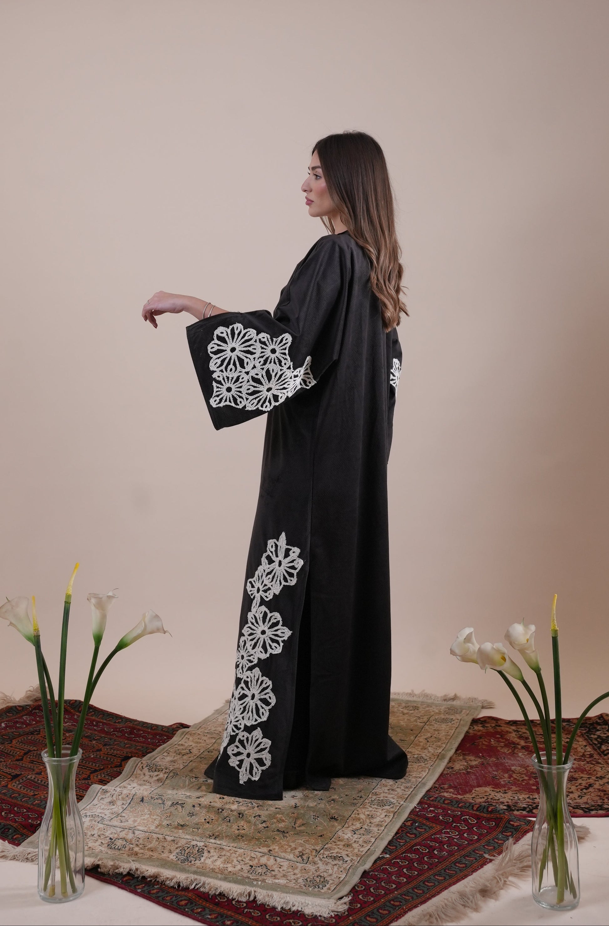 The flowered velvet kaftan is designed to make a subtle yet elegant statement. The kaftan features embroidered floral details along the sleeves and sides, adding a refined, feminine touch.