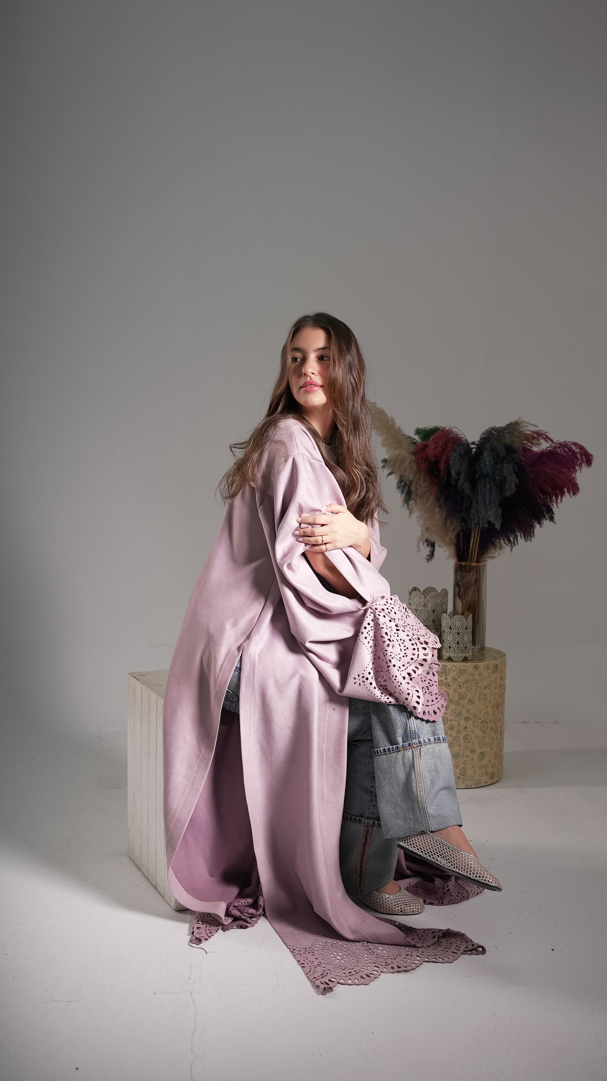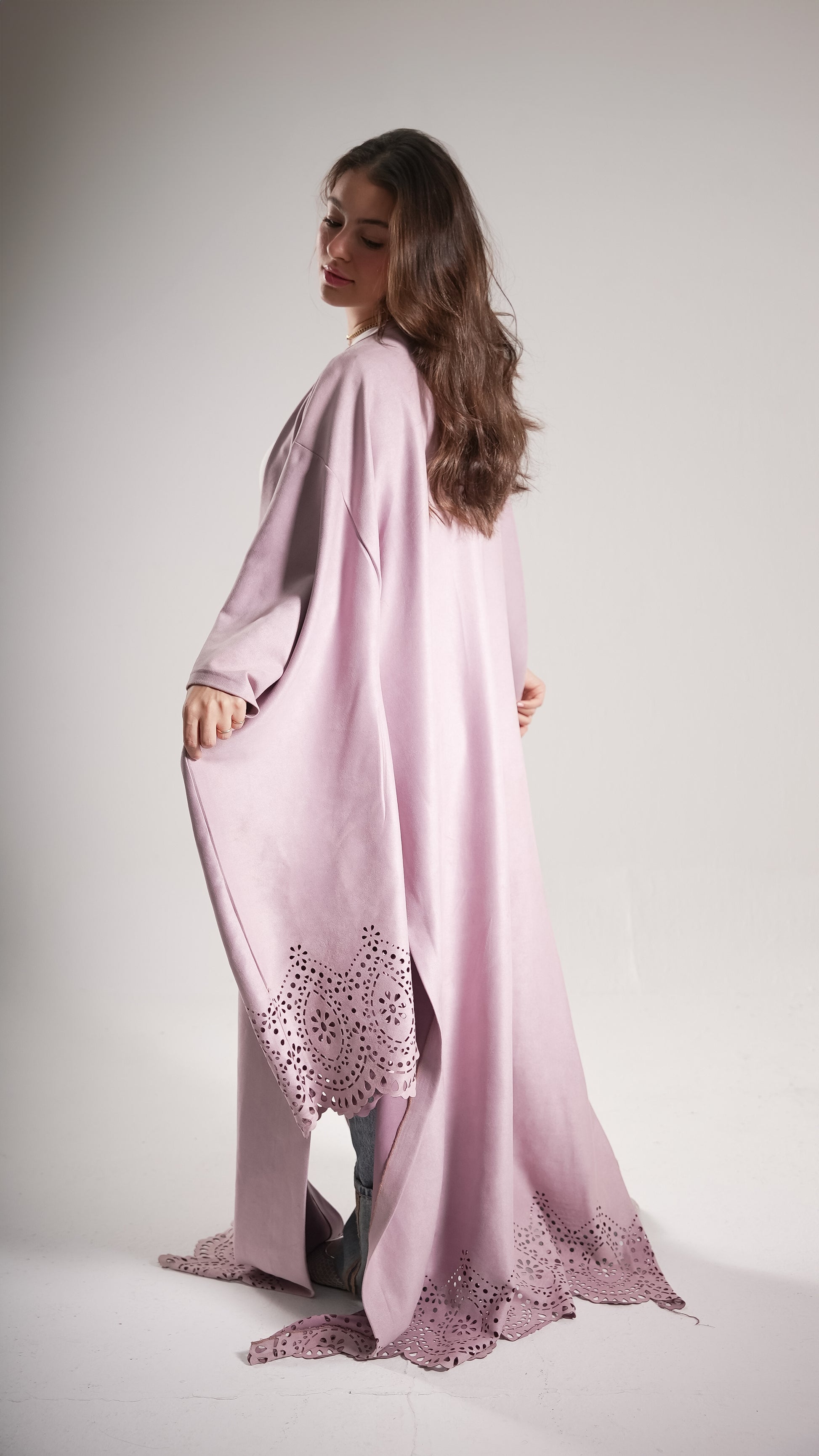 Our Suede Kaftan merges modern elegance with soft luxury. Crafted from a velvety suede-like fabric, this kaftan drapes beautifully, offering a sophisticated yet effortless look. The intricate laser-cut lace trim on the sleeves and hem adds a delicate, feminine touch, making it perfect for Ramadan.